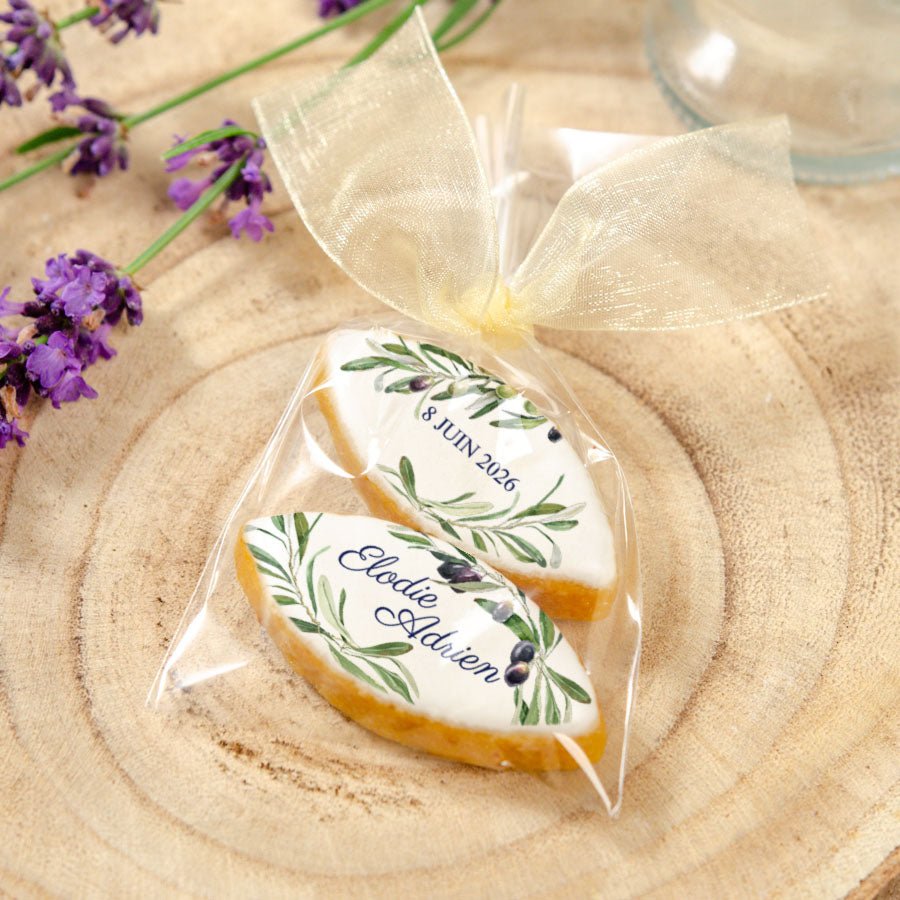 Un calisson d’Aix décoré de branches d’olivier, personnalisable avec vos prénoms ou un message. Une douceur provençale élégante et authentique.