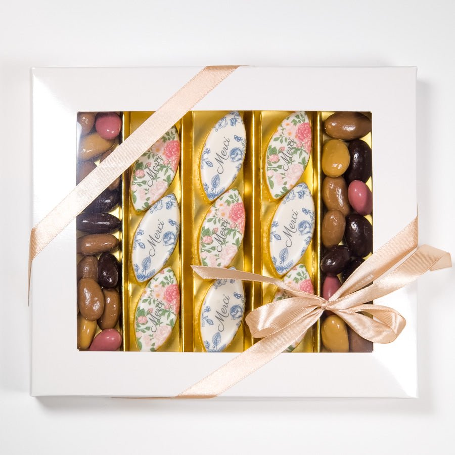 Un coffret raffiné composé de 9 calissons à personnaliser et d’un assortiment de douceurs chocolatées. Une attention élégante et gourmande pour remercier avec goût.