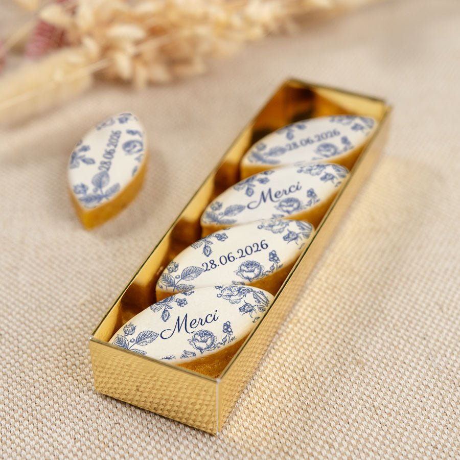 4 Calissons d'Aix-en-Provence personnalisés présentés dans une belle boîte dorée avec un couvercle transparent et un ruban de la couleur de votre choix.