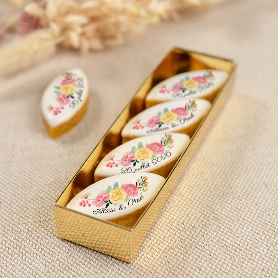Une boîte de 4 calissons d’Aix décorés du motif “Fleurs”, personnalisables avec vos prénoms, une date ou un message. Un cadeau raffiné et gourmand pour toutes vos occasions.