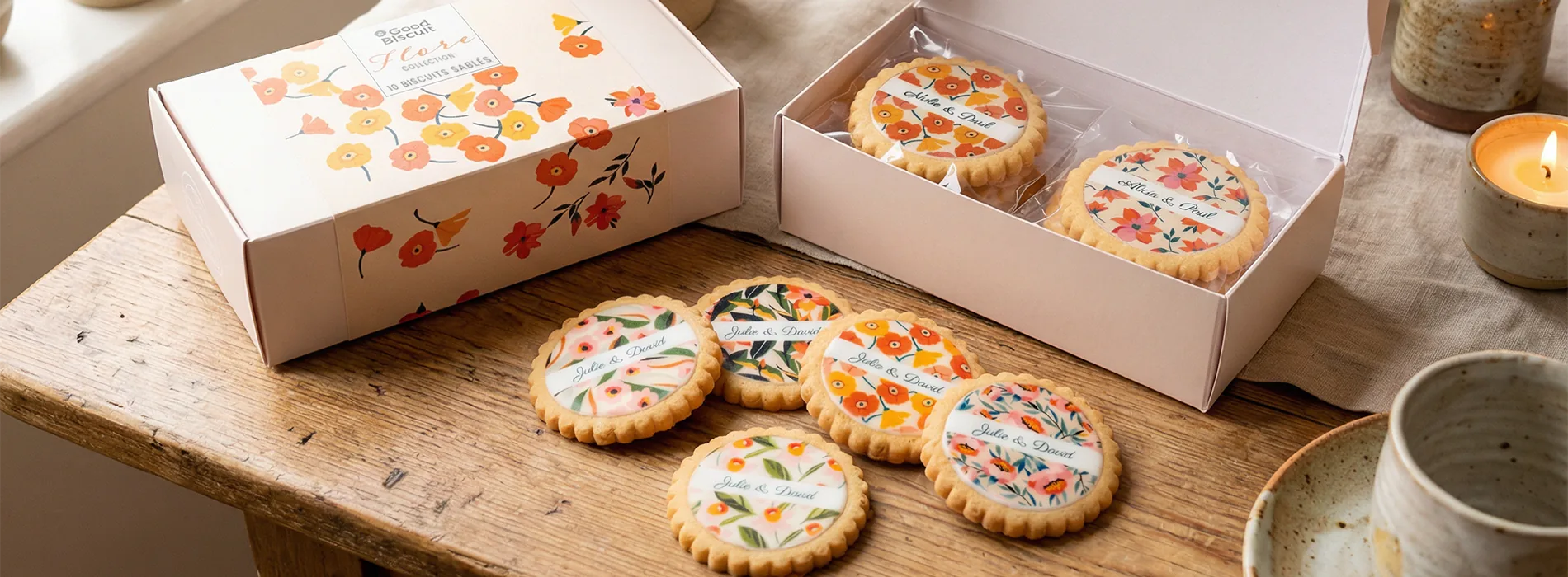 Les produits personnalisés gourmands permettent de créer des créations uniques en associant une recette soignée à un visuel imprimé avec précision. Biscuits personnalisés, calissons personnalisés et bientôt macarons personnalisés : chaque produit est pensé pour offrir un rendu à la fois gourmand et esthétique.
