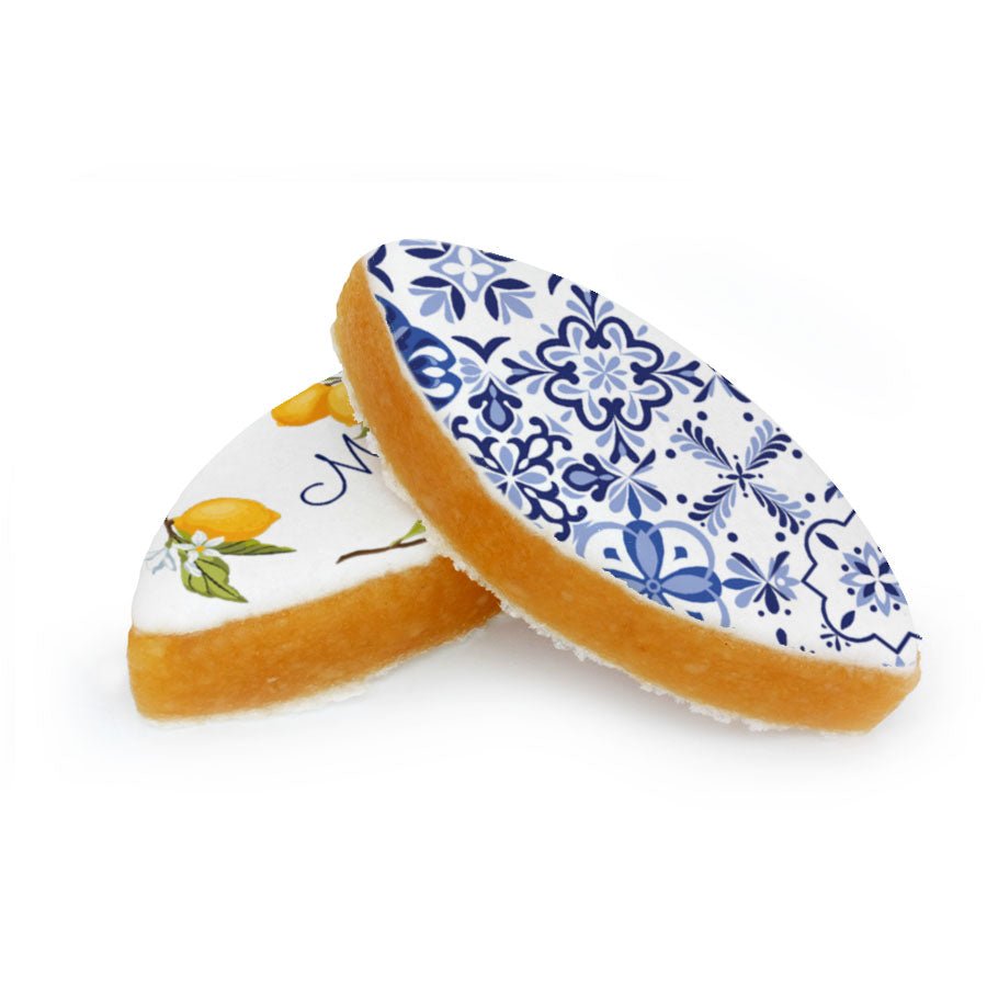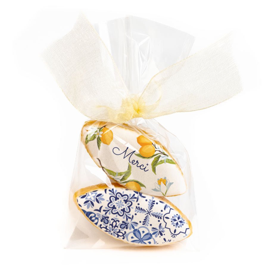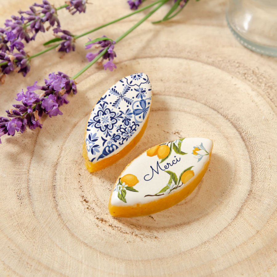 2 Calissons d'Aix-en-Provence à personnaliser avec vos textes. Emballés dans un élégant sachet fermé avec un ruban en organza de la couleur de votre choix.