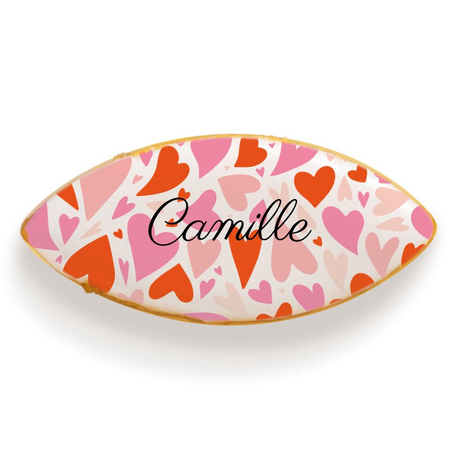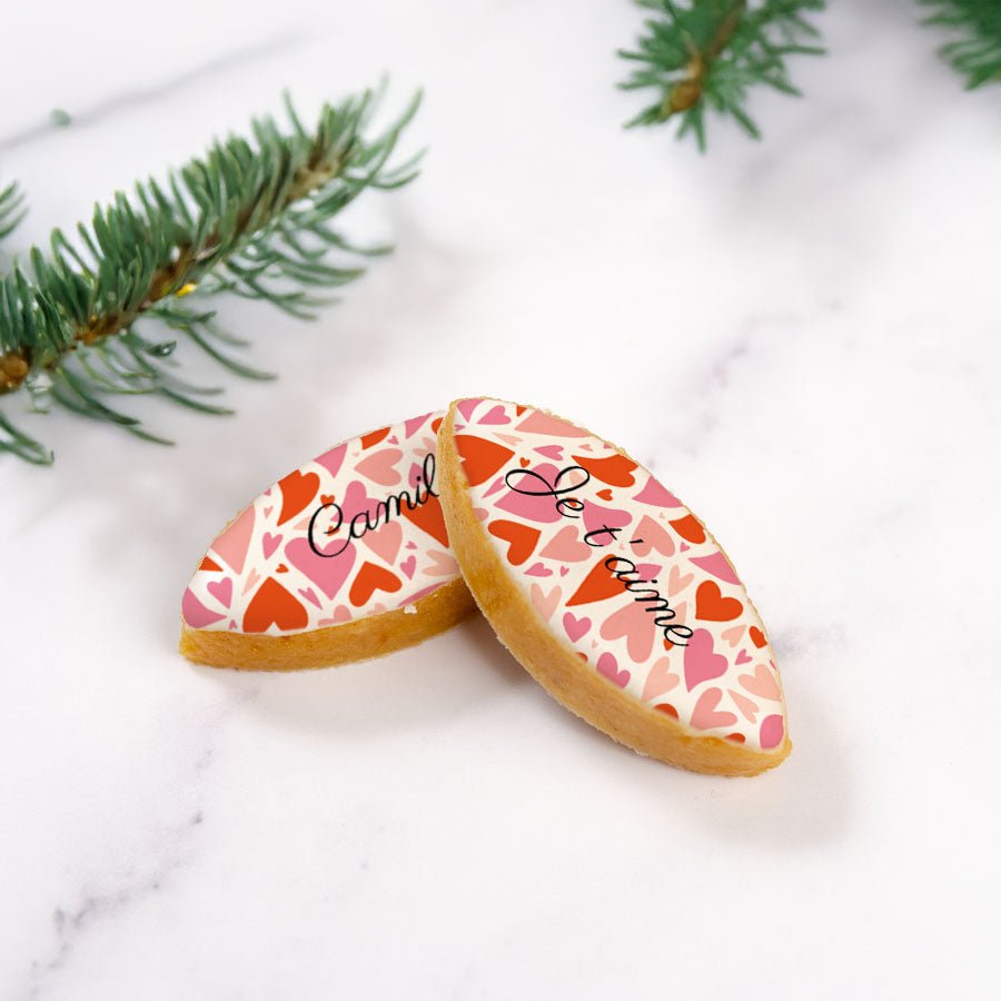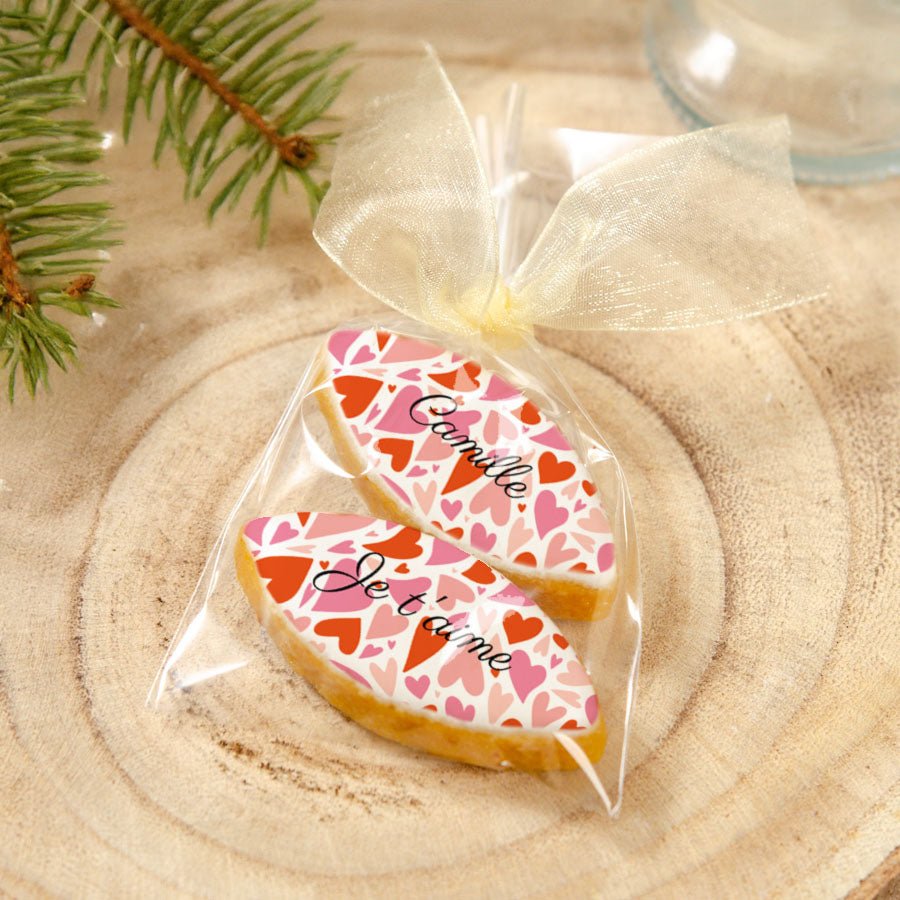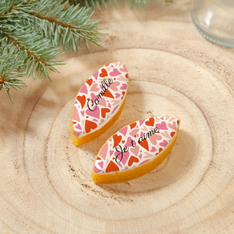 Ce joli sachet renferme deux calissons délicatement décorés d’un motif cœurs aux tons rosés, évoquant l’amour et l’affection. Personnalisés avec des prénoms ou un petit mot, ils deviennent un cadeau unique, parfait pour célébrer un moment spécial ou faire plaisir simplement. Présentés dans un sachet transparent noué d’un ruban de la couleur de votre choix, ces calissons sont idéals pour la Saint-Valentin ou une attention personnalisée à offrir avec le cœur.