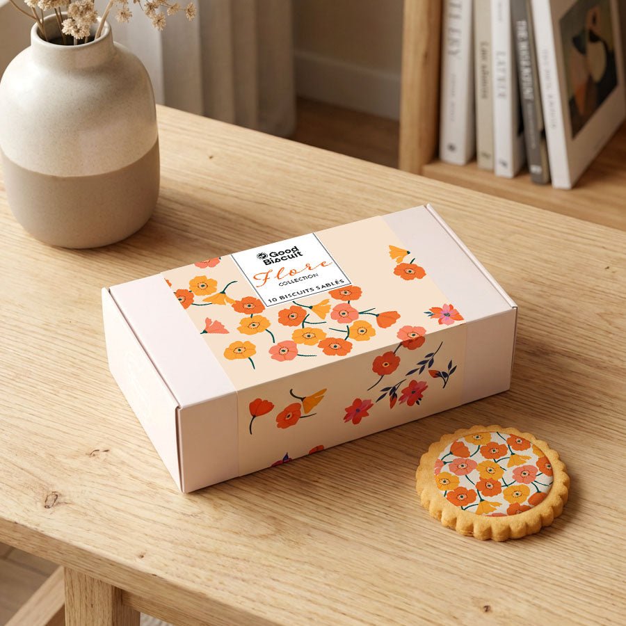 Comme un bouquet que l’on déguste, le coffret de biscuits décorés Flore séduit par ses motifs floraux délicats et ses couleurs douces, inspirées de l’univers printanier. Chaque biscuit est orné d’une illustration différente, pour une composition harmonieuse et pleine de fraîcheur visuelle.