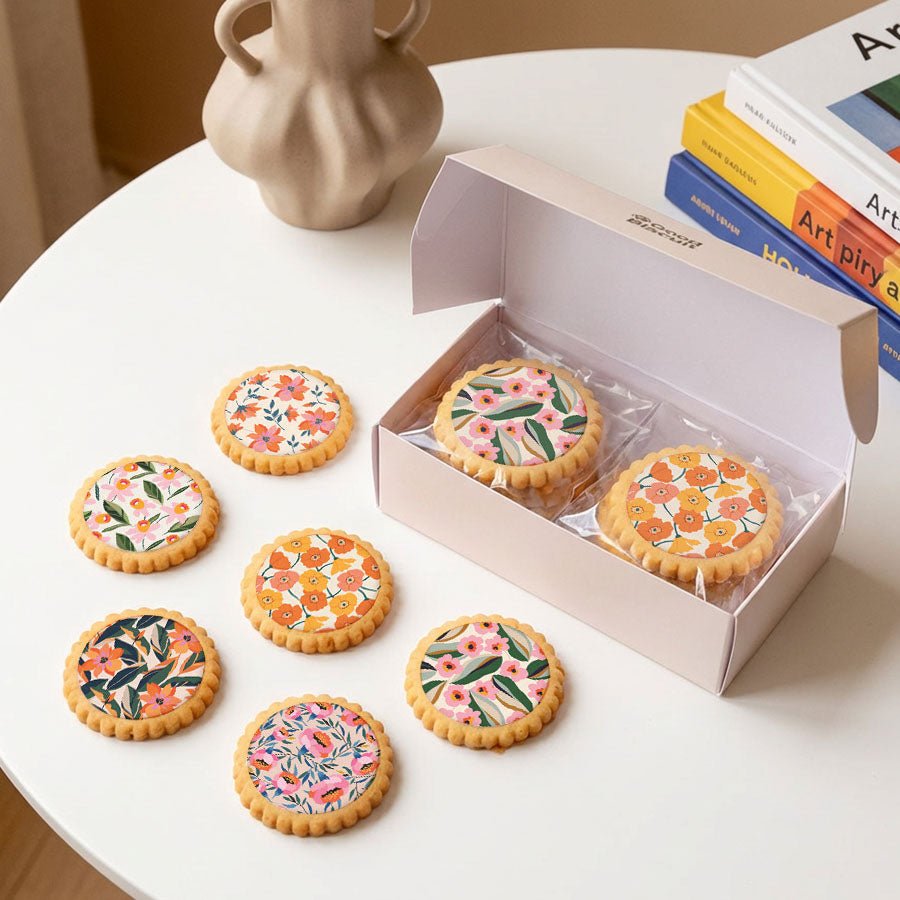 Les biscuits sont soigneusement recouverts d’un glaçage royal, puis imprimés avec précision dans notre atelier avant d’être emballés individuellement dans un sachet fraîcheur. Ils sont ensuite disposés dans un élégant coffret cartonné, idéal pour offrir à l’occasion d’un anniversaire, d’un remerciement ou simplement pour faire plaisir.