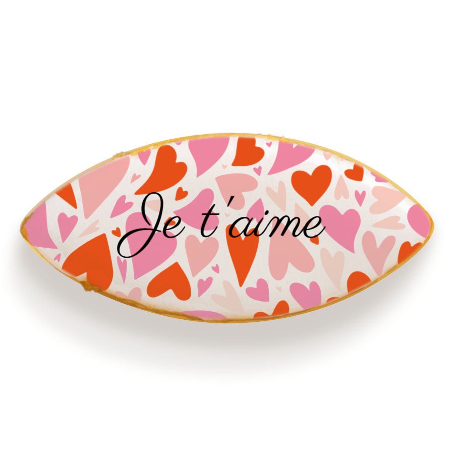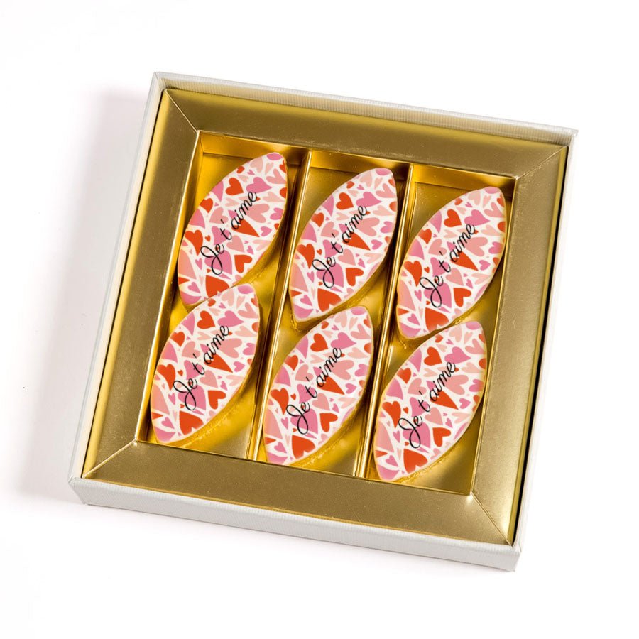 Ce coffret luxe renferme 6 calissons décorés d’un motif cœurs aux tons roses et rouges, avec la phrase "Je t'aime", sans personnalisation. Présentés dans une jolie boîte raffinée aux finitions dorées et accompagnés d’un ruban élégant, ces calissons sont parfaits pour faire plaisir en toute simplicité. Un cadeau gourmand et délicat, idéal pour la Saint-Valentin, un anniversaire ou une petite attention pleine d’amour.